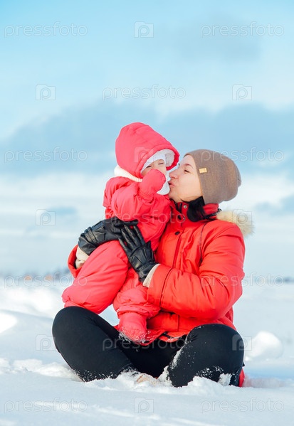 Мать целует ребенка, сидя на снегу в зимний день