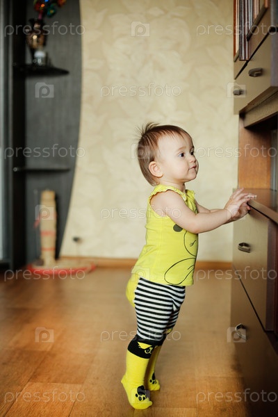 Любопытный малыш исследует обстановку дома, тянется к ручке ящика