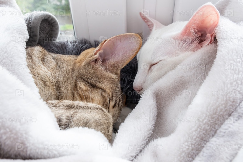 Милая ориентальная короткошерстная белая кошка и маленький полосатый котенок спят вместе