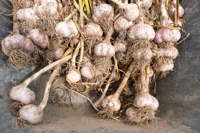 Сбор урожая чеснока в тачке