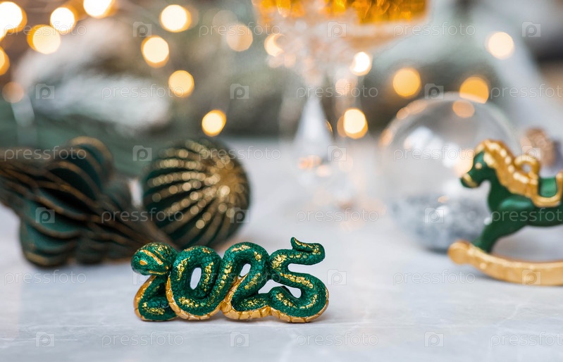 Символ года — зеленая змея, бокал шампанского, ветки елки и рождественские украшения на сером фоне. Концепция Веселого Рождества и Нового года 2025