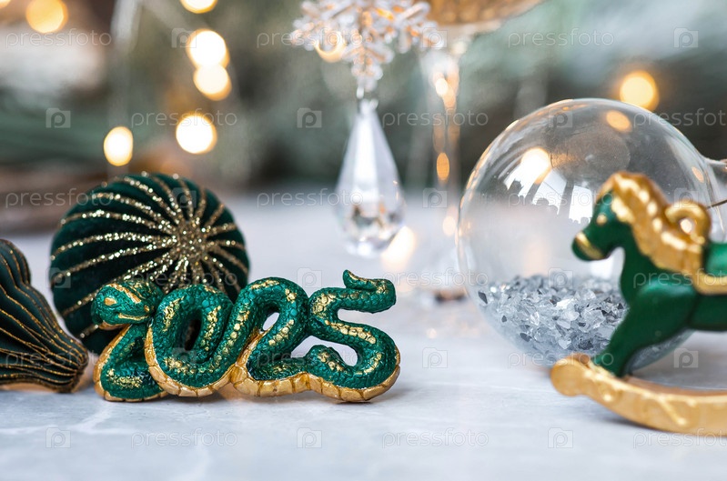 Символ года — зеленая змея, бокал шампанского, ветки елки и рождественские украшения на сером фоне. Концепция Веселого Рождества и Нового года 2025