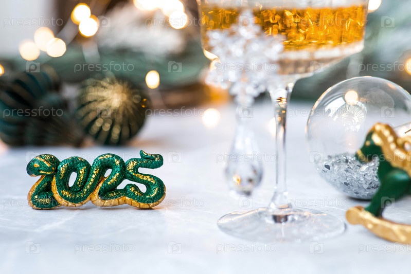Символ года — зеленая змея, бокал шампанского, ветки елки и рождественские украшения на сером фоне. Концепция Веселого Рождества и Нового года 2025