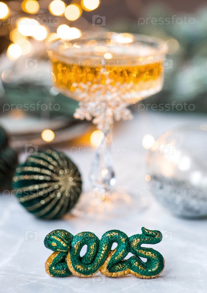 Символ года — зеленая змея, бокал шампанского, ветки елки и рождественские украшения на сером фоне. Концепция Веселого Рождества и Нового года 2025