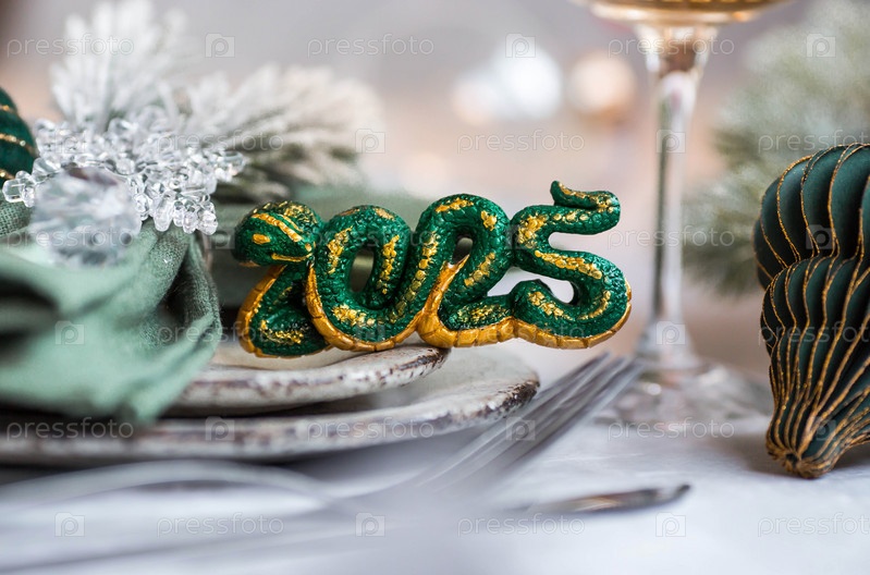 Стильные тарелки, салфетка, бокал, шампанское, ветки елки и рождественские украшения на сером фоне. Сервировка стола. Концепция Веселого Рождества и Нового года 2025