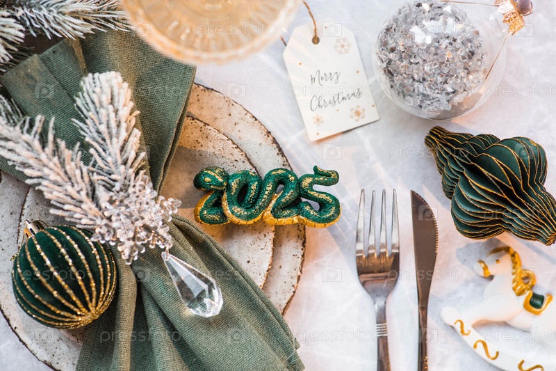Стильные тарелки, салфетка, бокал, шампанское, ветки елки и рождественские украшения на сером фоне. Сервировка стола. Концепция Веселого Рождества и Нового года 2025