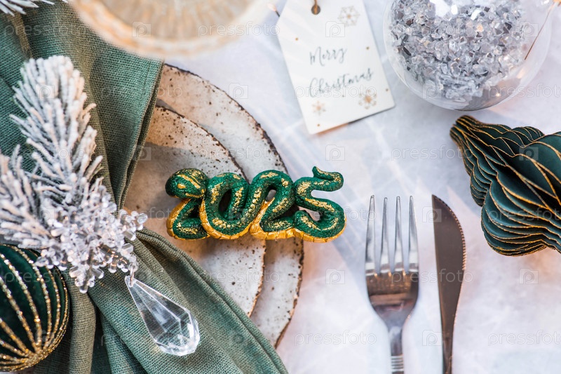 Стильные тарелки, салфетка, бокал, шампанское, ветки елки и рождественские украшения на сером фоне. Сервировка стола. Концепция Веселого Рождества и Нового года 2025