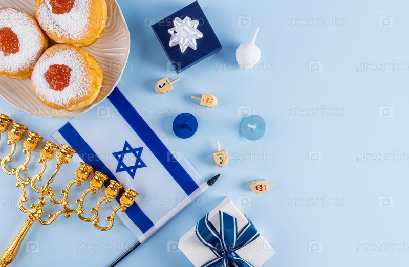 Жареный пончик с сахарной пудрой и джемом на тарелке, свечи, минор, дрейделы на синем фоне. Концепция Хануки. Копировальное пространство