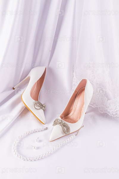 Пара классических белых свадебных туфель среди складок белого атласного платья, фаты, жемчужных украшений. вертикальный вид. Концепция свадьбы