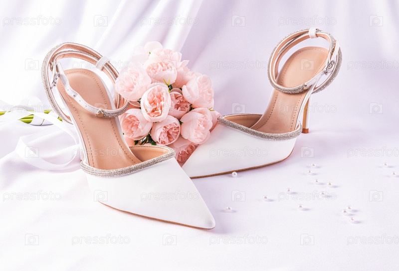 Стильная свадебная композиция с шикарными белыми туфлями, букетом розовых пионов на атласном фоне с белой вуалью. натюрморт. утро невесты