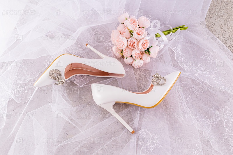 Красивые белые туфли невесты лежат на нежной фате невесты со свадебным букетом розовых пионов. Верхний вертикальный вид. открытка. обои