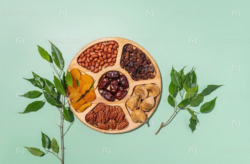 Большой деревянный манеж с миксом сухофруктов и орехов среди зеленых молодых ветвей. Вид сверху. Традиционная еда и символы Ту Бе Швата