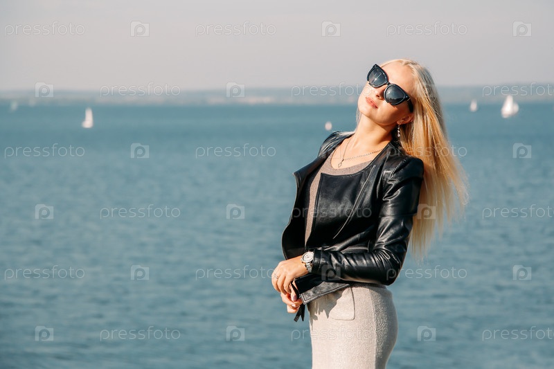 Молодая женщина с длинными светлыми волосами, в солнцезащитных очках и кожаной куртке позирует на берегу моря