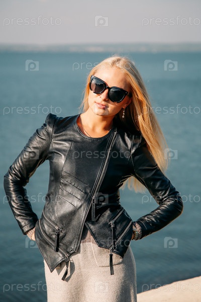 Модная блондинка в солнцезащитных очках и черной кожаной куртке позирует на берегу моря в солнечный день