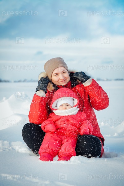 Мать и ребенок сидят на снегу, одетые в теплую зимнюю одежду, наслаждаясь прекрасным снежным днем
