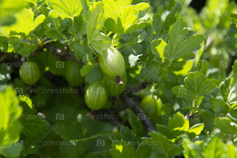 Зеленые ягоды крыжовника на фоне зеленых листьев