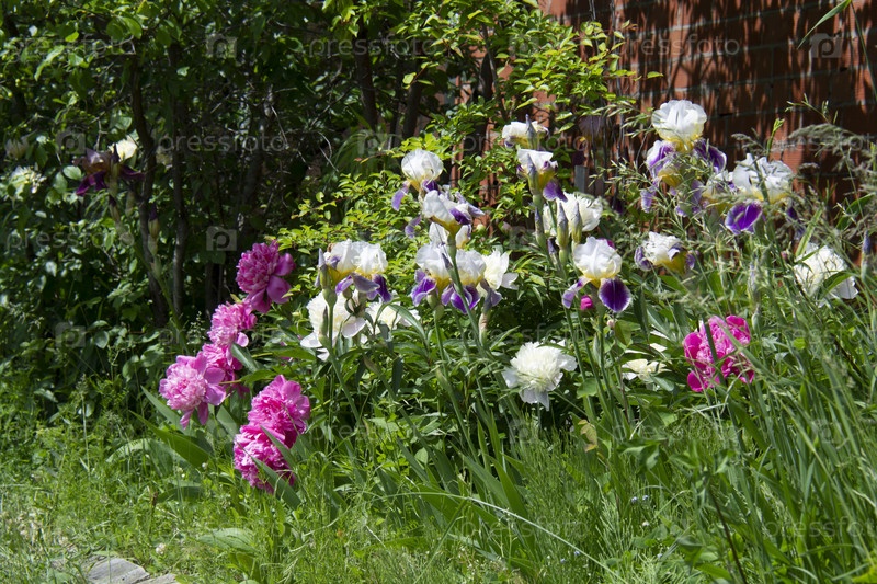 Белые и розовые пионы и бело-фиолетовые ирисы на клумбе