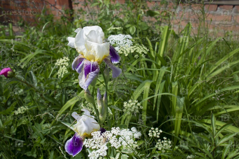 Красивые бело-фиолетовые ирисы на фоне зеленых листьев в саду летом