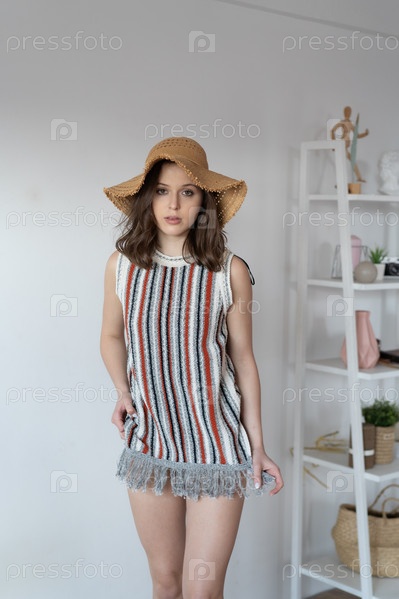 Молодая красивая женщина позирует в коротком платье в студии