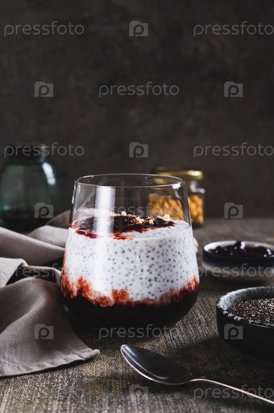 Чиа-пудинг с йогуртом и джемом из черной смородины в стакане на столе вертикальный вид