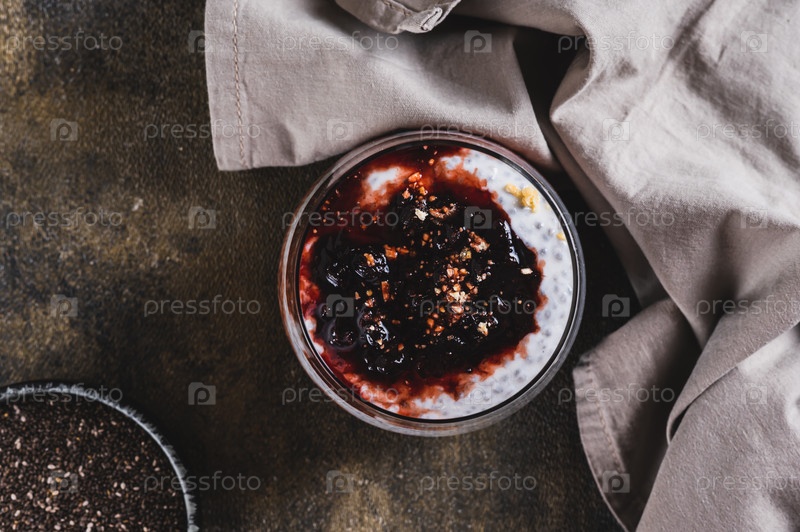 Крупный план чиа-пудинга с йогуртом и джемом из черной смородины в стакане на столешнице