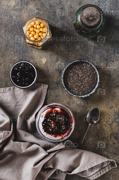 Йогуртовый пудинг с чиа и джемом из черной смородины в стакане на столешнице и вертикальный вид
