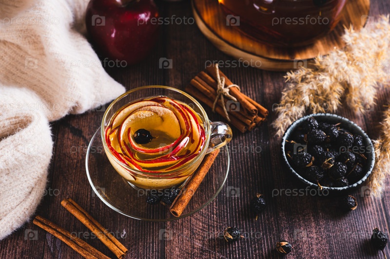 Цветок розы из кусочков яблока в чашке чая с шиповником на столе