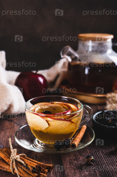 Ароматный чай с лепестками яблок, шиповником и корицей в чашке на столе вертикальный вид