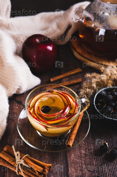 Цветок розы из кусочков яблока в чашке чая с шиповником на столе вертикальный вид