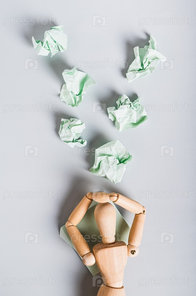 Смятые бумажные листки падают на сгоревшего человека на светлом фоне сверху и вертикальном виде