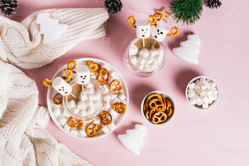 Зефир и крендель в виде оленя в какао-чашках в украшениях рождественского стола, вид сверху
