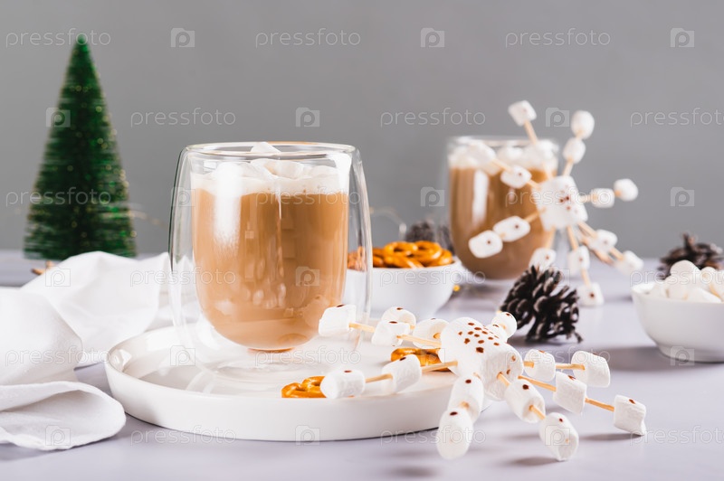 Теплое какао в чашках и снежинки из зефира и глазури на тарелке на столе
