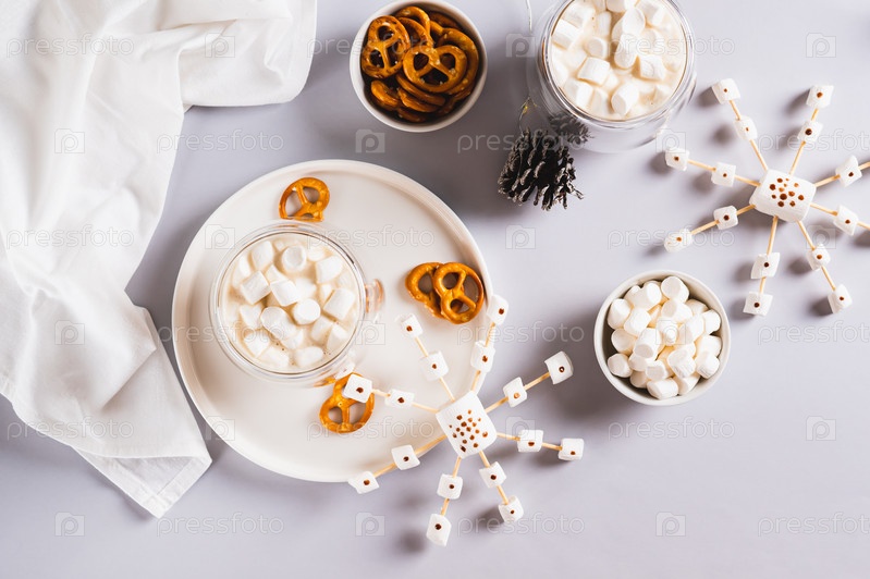 Теплое какао в чашках и снежинки из зефира и глазури на тарелке вид сверху