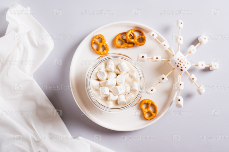 Крупный план какао в чашках и снежинок из зефира и глазури на тарелке, вид сверху