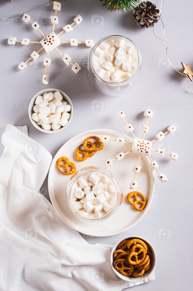 Горячий шоколад с зефиром и крендельками и снежинкой на тарелке сверху и вертикальный вид