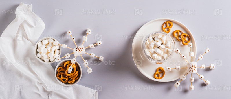 Горячий шоколад с зефиром и крендельками и снежинкой на тарелке вид сверху веб-баннер