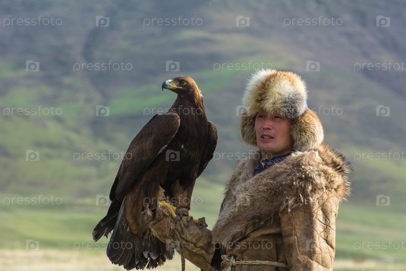 Мужчина азиатской национальности, киргиз, в национальной одежде, в горах, держит на руке орла
