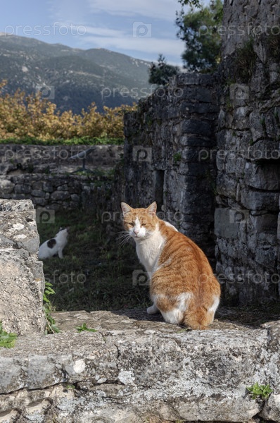 Красивый рыже-белый кот сидит на стене в солнечный осенний день