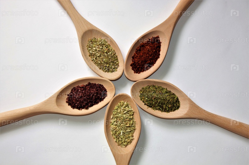 Различные специи для приготовления блюд в деревянных ложках на белом фоне: базилик, тимьян, фенхель, сумах, чили