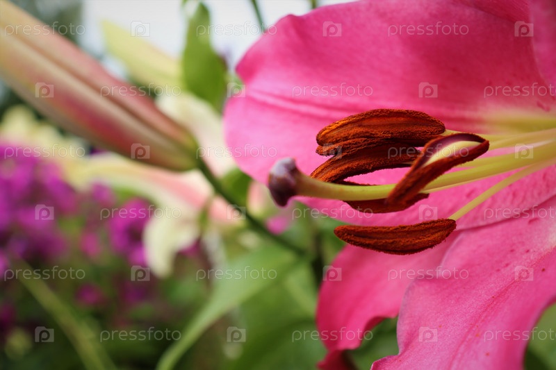 Крупный план тычинок и пестика цветущего розового цветка лилии. Естественный фон красивых лепестков лилии и бутона лилии, мягкий селективный фокус