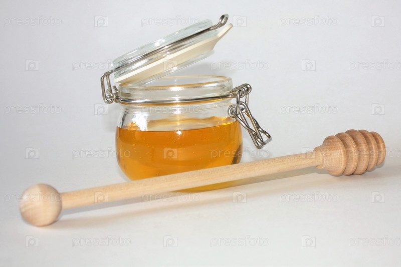 Банка меда и специальная деревянная ложка на белом фоне, крупный план