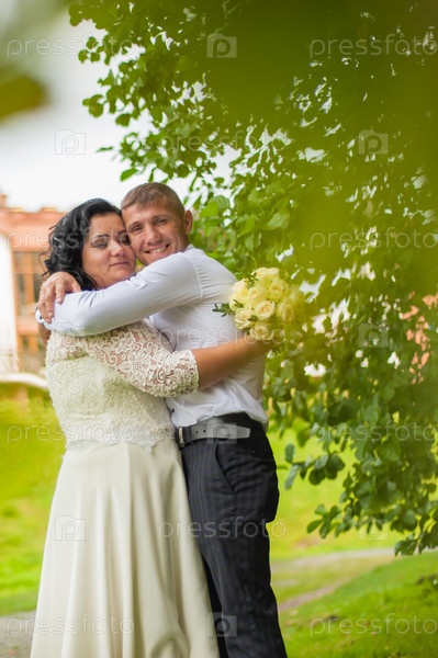 Жених и невеста крепко-крепко обнимаются на свадебной фотосессии