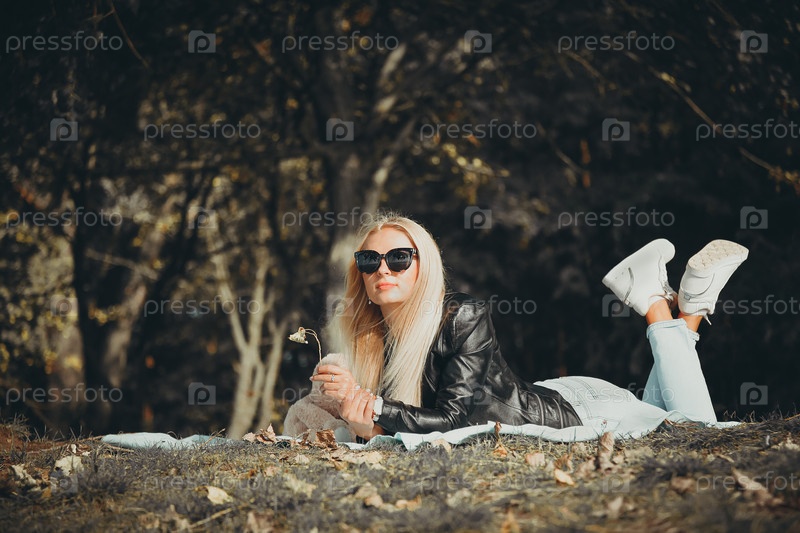 Молодая женщина в солнцезащитных очках и кожаной куртке лежит на одеяле в парке, держа в руках увядший цветок