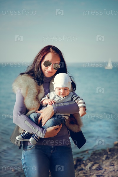 Мать в солнцезащитных очках и меховой жилетке держит ребенка на руках на пляже