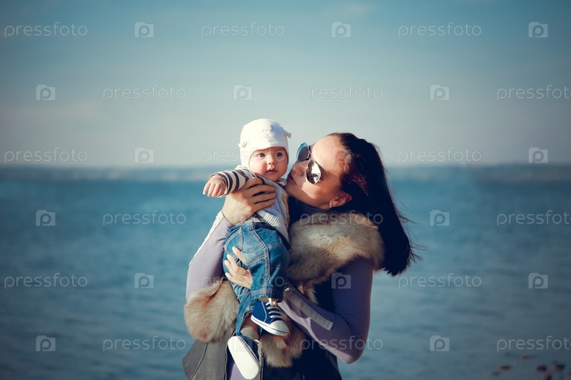 Мать держит на руках и целует своего ребенка, одетого в шляпу, джинсы и кроссовки, у моря в солнечный день