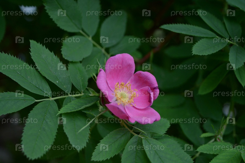 Розовый цветок шиповника на фоне зеленых листьев