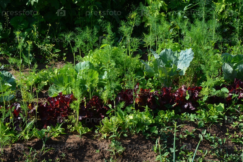 Зеленый и красный салат на грядке