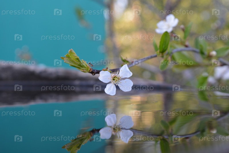 Ветка с белыми цветами вишни отражается в воде
