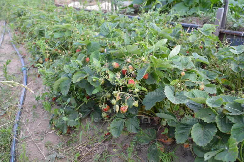 Грядка с земляникой в саду летом