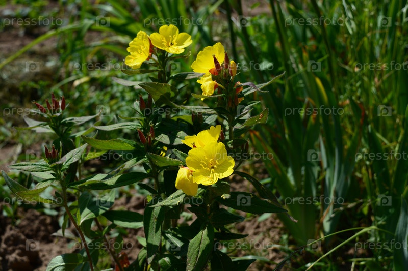 Желтые цветы на фоне зелени.Энотера двулетняя, или Ослинник